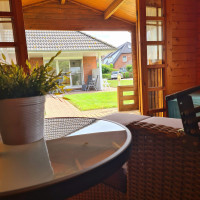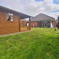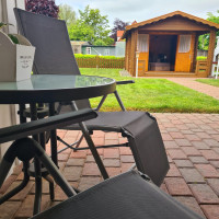 Unser Bungalow bietet Ihnen eine große modern eingerichtete Wohnfläche zur puren Entspannung. Das Wohn- und Esszimmer ist mit einer schönen Fensterfront zum Garten ausgestattet. Unsere überdachte Terrasse ist ebenfalls voll möbiliert und bietet einen Ausblick auf den Garten.