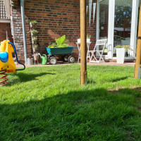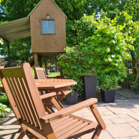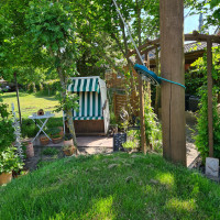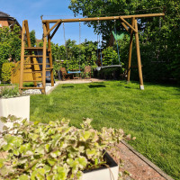 Unser 1200m² großer Garten bietet Ihnen mehrere Terrassen und Kinderspielgeräte wie einen großen Sandkasten, eine Rutsche, eine Schaukel, einen Kletterturm, sowie ein Trampolin, eine Seilbahn u.v.m.